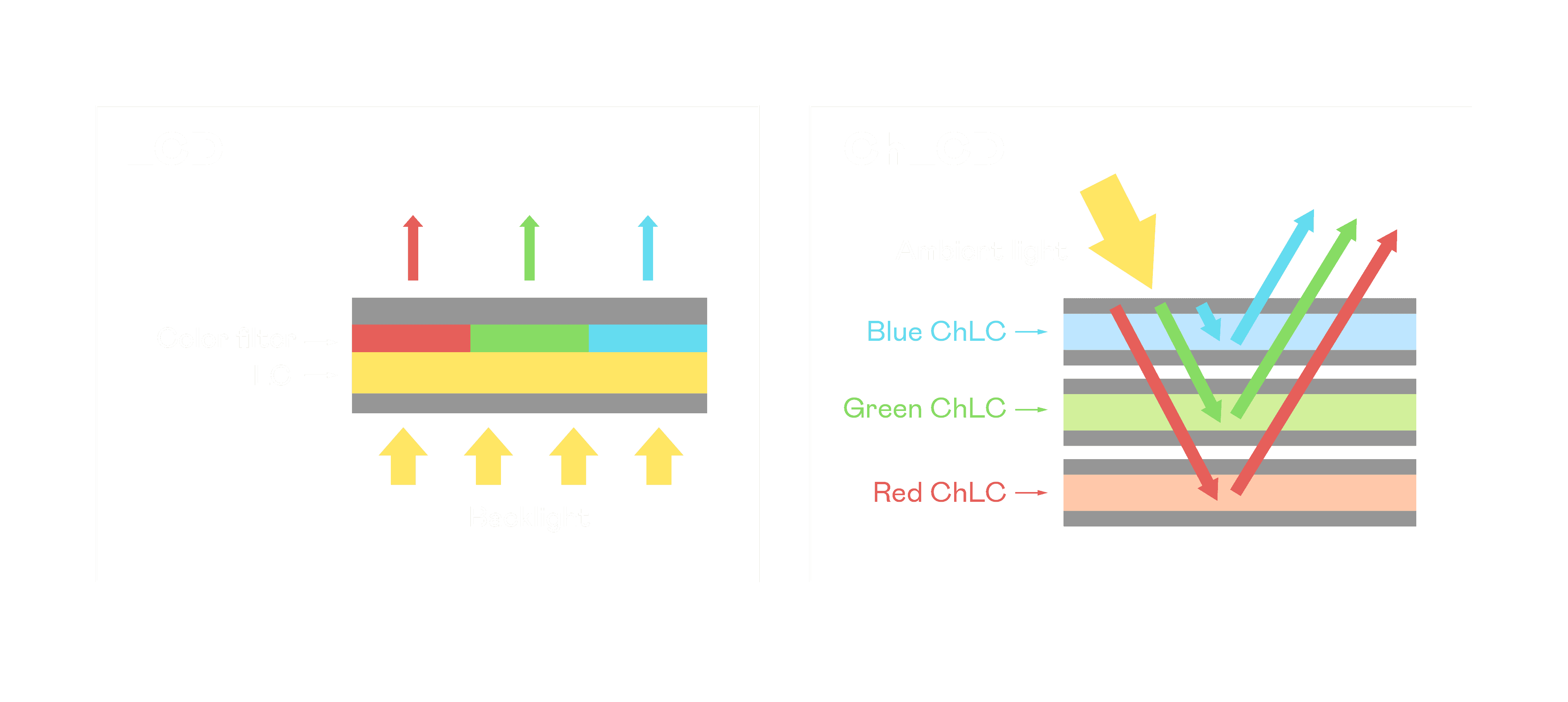 ChLCD 胆固醇液晶就如同纸张一样,,,透过反射环境光来显示影像,,因此长时间观看不易造成人眼视觉疲劳,,,可达到护眼效果。。。当处于户外阳光下使用,,LCD 影像容易失真而不易观看,,但胆固醇液晶仍可维持较佳的影像品质。。。