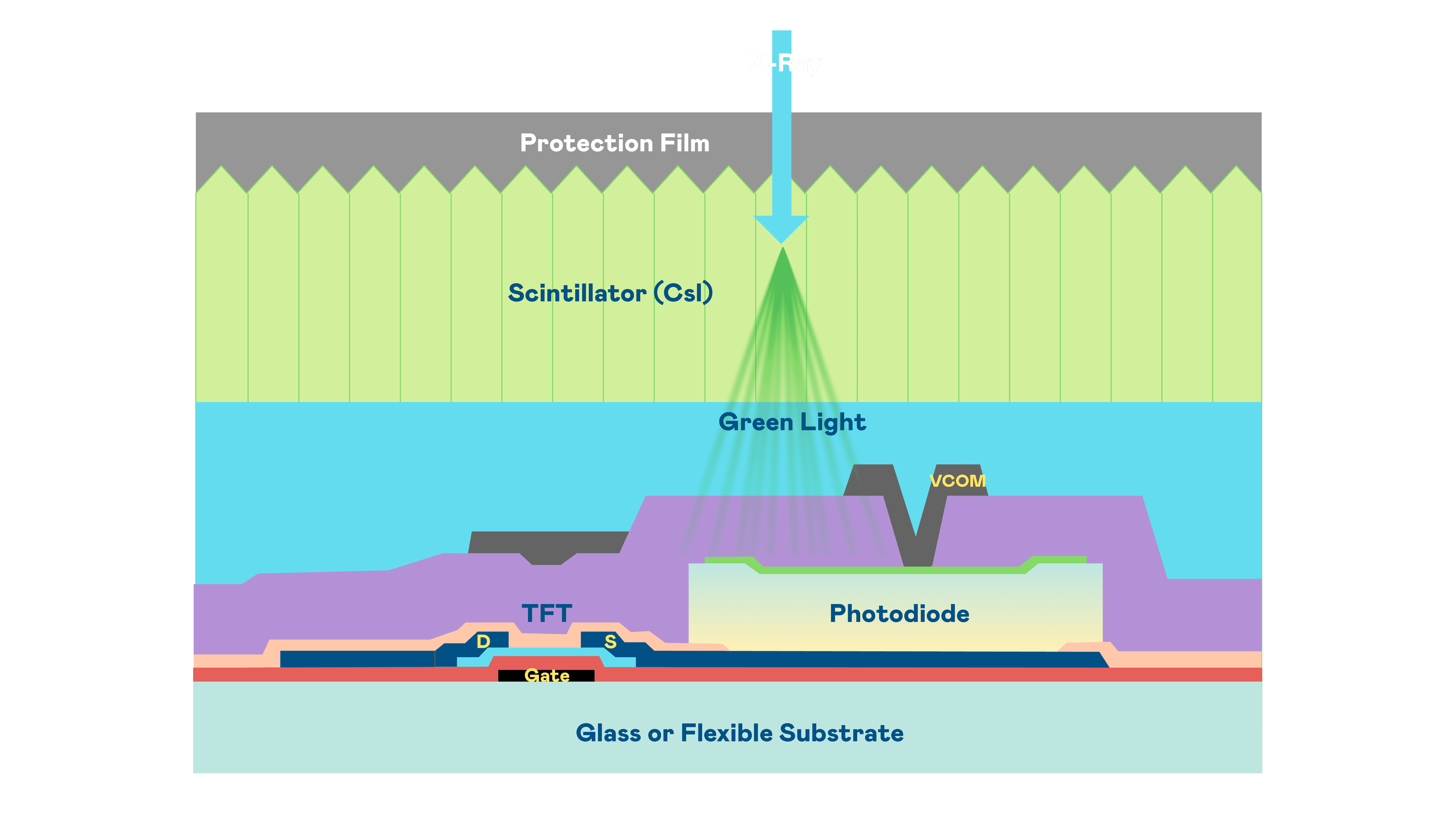 28国际的X光影像感测阵列使用薄膜电晶体 (TFT) 作为每个像素的读取开关,,,,搭配光电二极体(Photodiode)的光电转换元件,,,,用以感测X光影像讯号。。